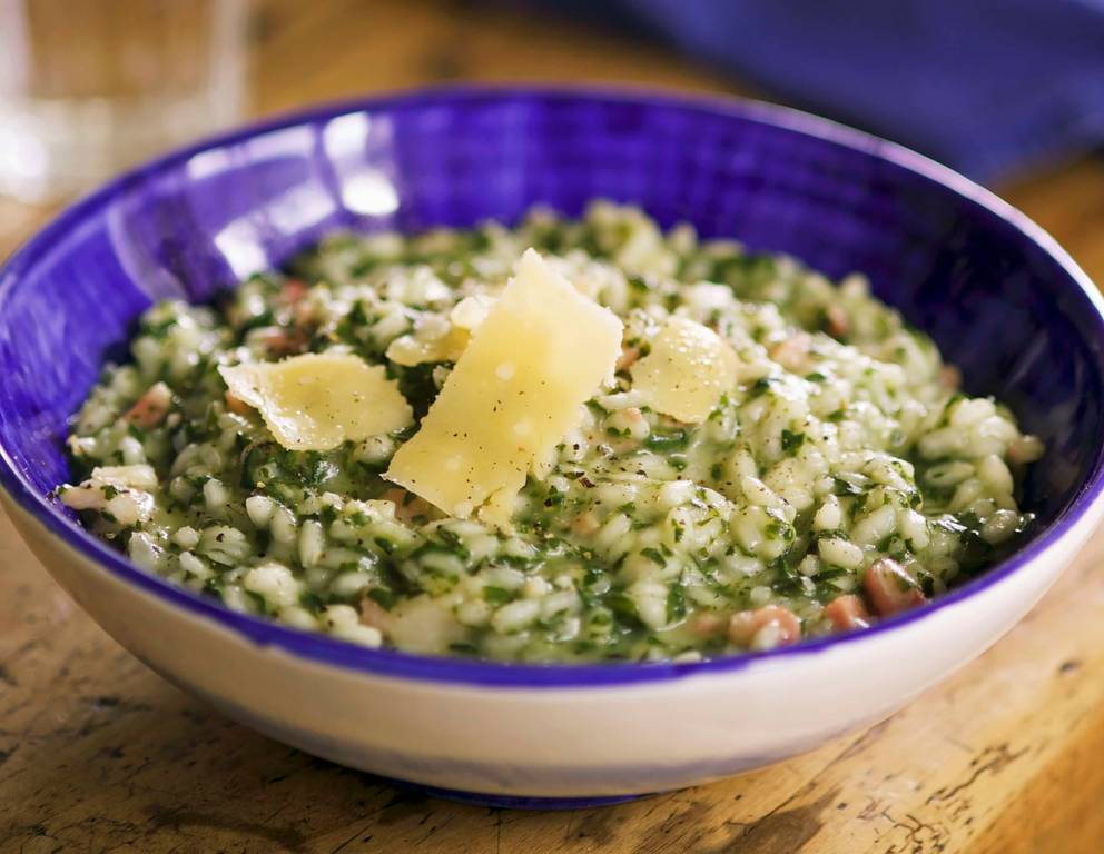 - Zum Schluss den Parmesan, Butter, Spinat und Basilikum unter das Risotto rühren und mit Salz und Pfeffer abschmecken.