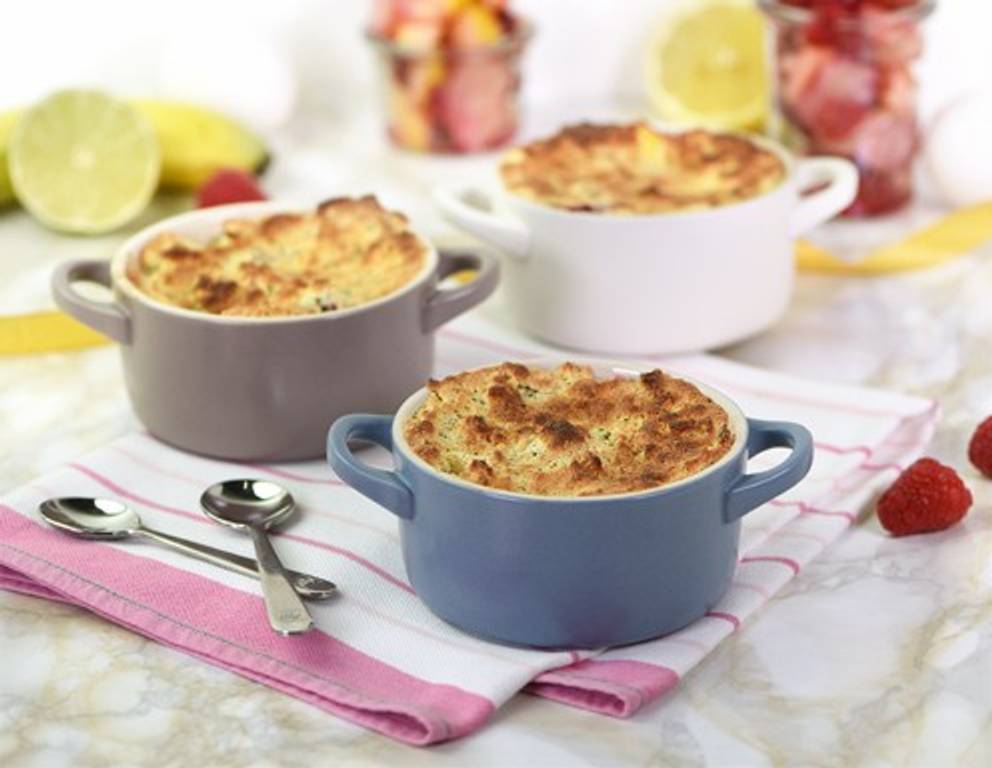 - Eigelb mit Honig, Vanillemark, Rum, Orangenlikör und Orangen- sowie Zitronensaft vermischen. Die Eiweiß zu einem festen Schnee schlagen und unter die Eigelbmasse heben. Das geschnittene Obst in kleine, feuerfeste Formen füllen, mit der Schneemasse bedecken und bei 180 Grad (Umluft) für ungefähr 10 Minuten im Ofen überbacken.