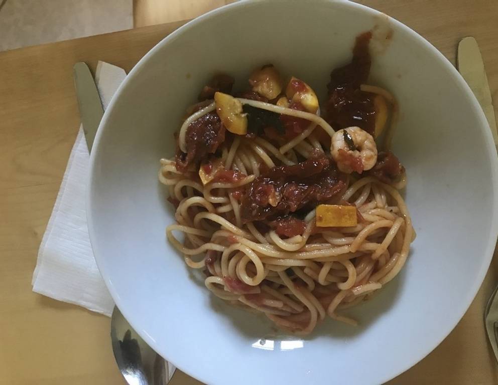 - Für die Spaghetti mit Garnelen die Spaghetti in Salzwasser al dente kochen. Knoblauchzehe pressen und in Olivenöl anbraten. Garnelen kalt abspülen und zum Knoblauch geben.