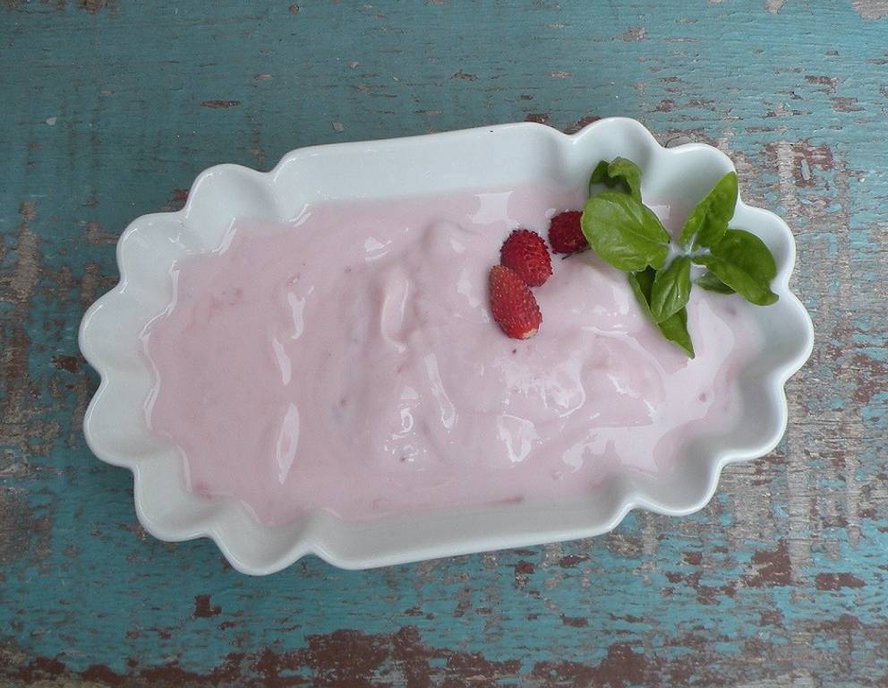 Das Walderdbeerjoghurt kann anstatt mit Rosensirup auch mit Holunderblütensirup verfeiner werden.