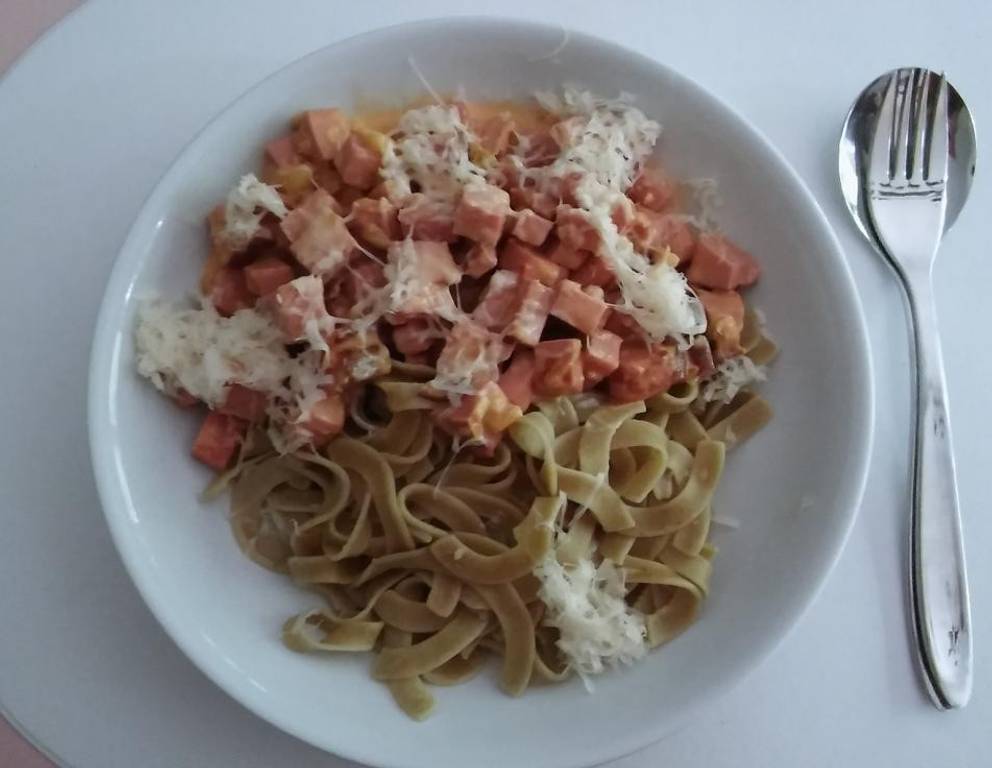 - Die Leberkäse-Paprika-Sauce mit Bandnudeln anrichten und servieren.
