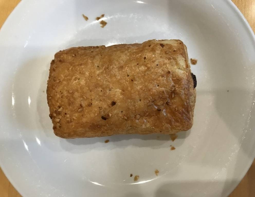 - Den Plunderteig in 2x4 cm große Rechtecke schneiden, die Schokolade in Rippen brechen.