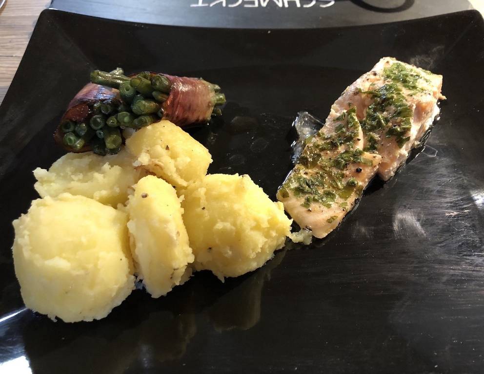 - Das Lachsfilet mit Fisolen im Speckmantel und den Kartoffeln anrichten und servieren.