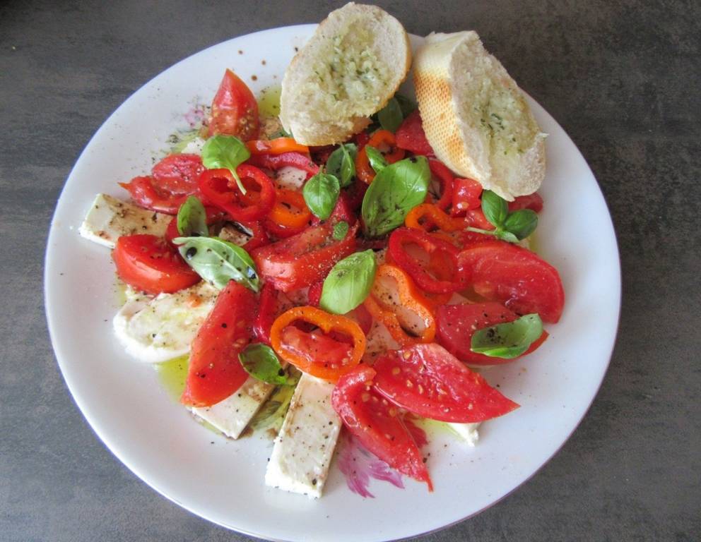 Statt Basilikum passt auch Rucola geschmacklich hervorragend zu den Tomaten mit Mozzarella und Schafkäse.