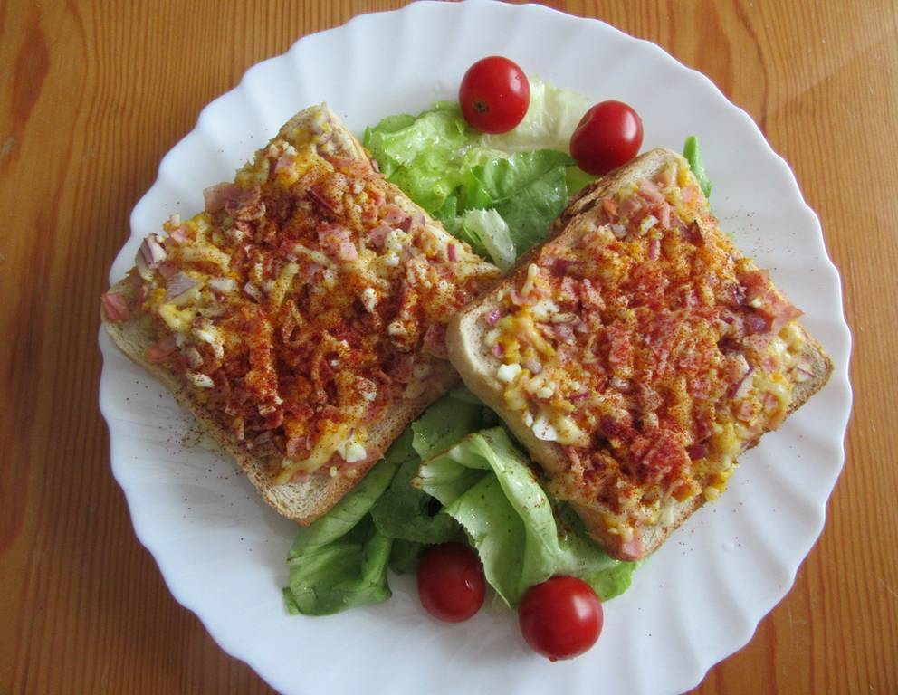 Die Toasts mit Schinken, Käse und Ei auf Blattsalat können nach Belieben mit Schinken und Käsesorte nach Wahl zubereitet werden.