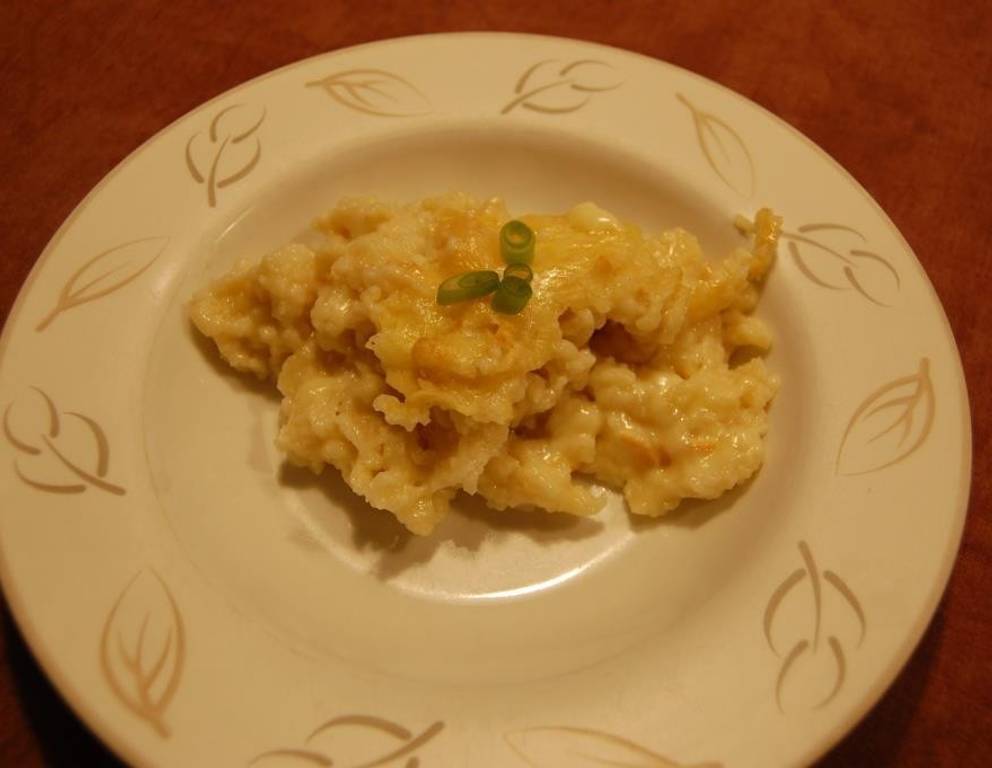 - Die Spätzle abwechselnd mit den verschiedenen Käsesorten in eine Auflaufform schichten. Die letzte Schicht sollte Emmentaler sein. Bei 200 °C ca. 30 Minuten im Backofen backen.