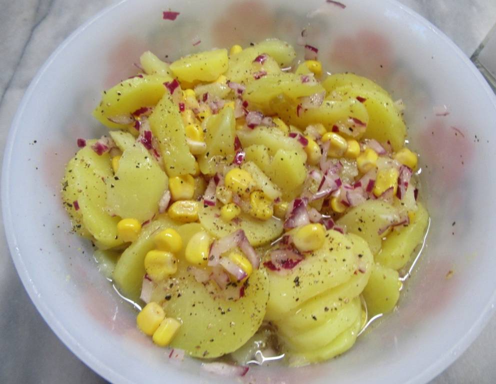 - Die in Scheiben geschnittenen Erdäpfel zum Mais in die Schüssel geben, gehackten Zwiebel sowie Marinade darüber verteilen, durchrühren und den Salat mit Pfeffer würzen.