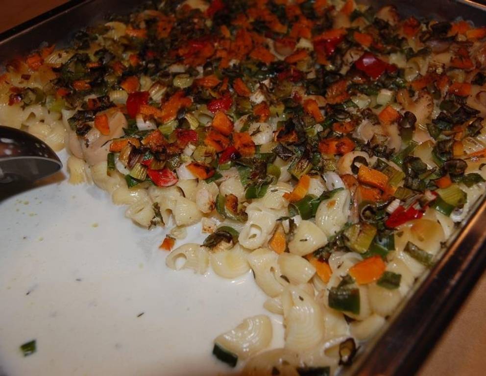 Wer keinen Käse mag, kann ihn für die anderen Mitesser zum schnellen Nudelauflauf separat servieren! Die Nudeln sollten von der Soße und dem Gemüse gut bedeckt sein!