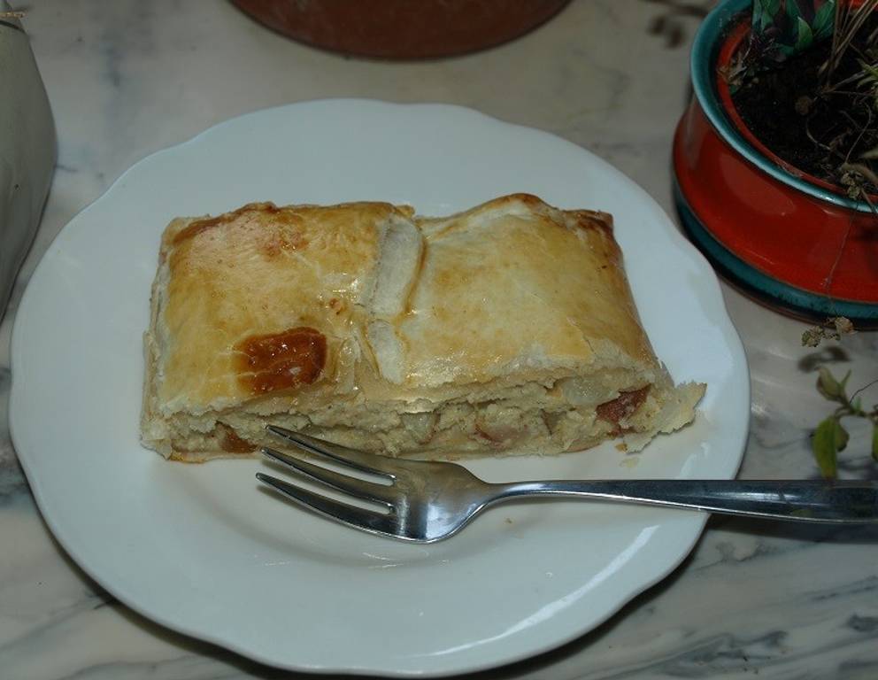 - Die kleinen Birnenstücke daruntermischen. Auf einem Backblech den Blätterteig ausrollen. Die Fülle mittig darauf verteilen, zusammenklappen und mit dem restliche Ei bestreichen.