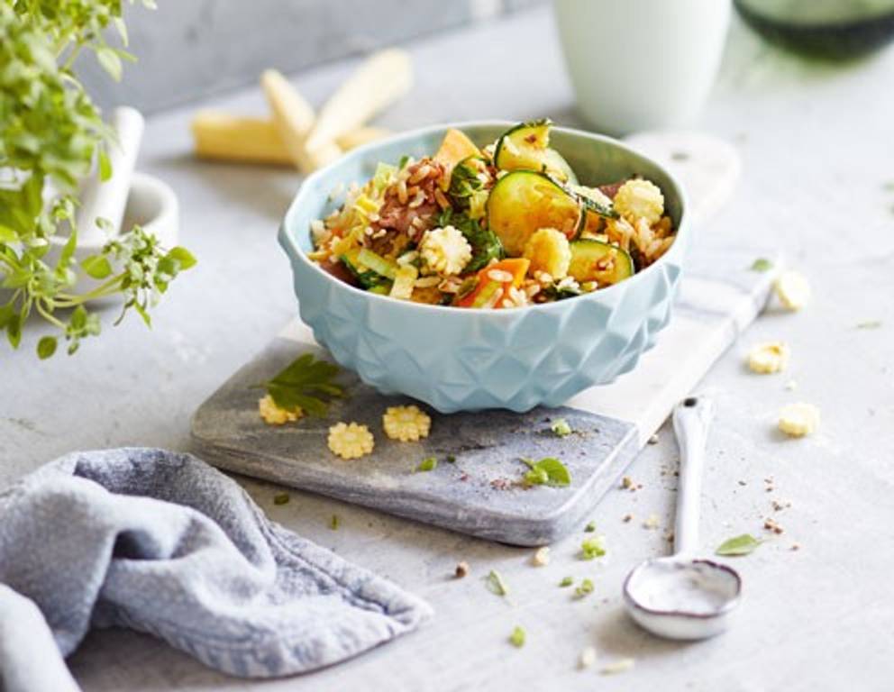 - Reis nach Packungsanleitung in Salzwasser garen. Anschließend abgießen und auskühlen lassen.