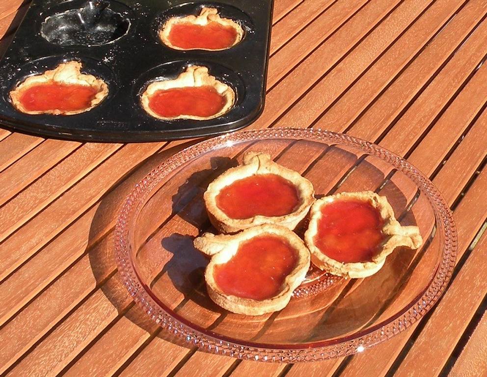 - In jedes Förmchen einen EL Quittengelee geben und die Quittentörtchen bei 180 Grad Ober/Unterhitze so lange backen bis der Teig ein wenig Farbe angenommen hat und das Gelee leicht Blasen schlägt.