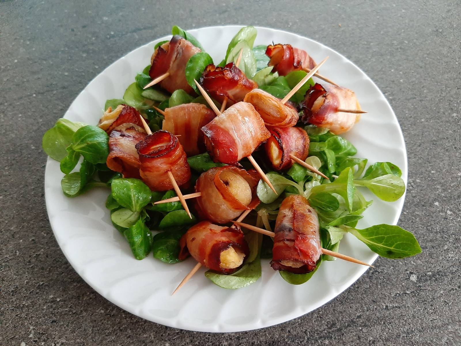 - Die Maroni im Speckmantel auf das Backblech legen und für 5-10 Minuten ins Backrohr schieben, bis der Speck knusprig ist.