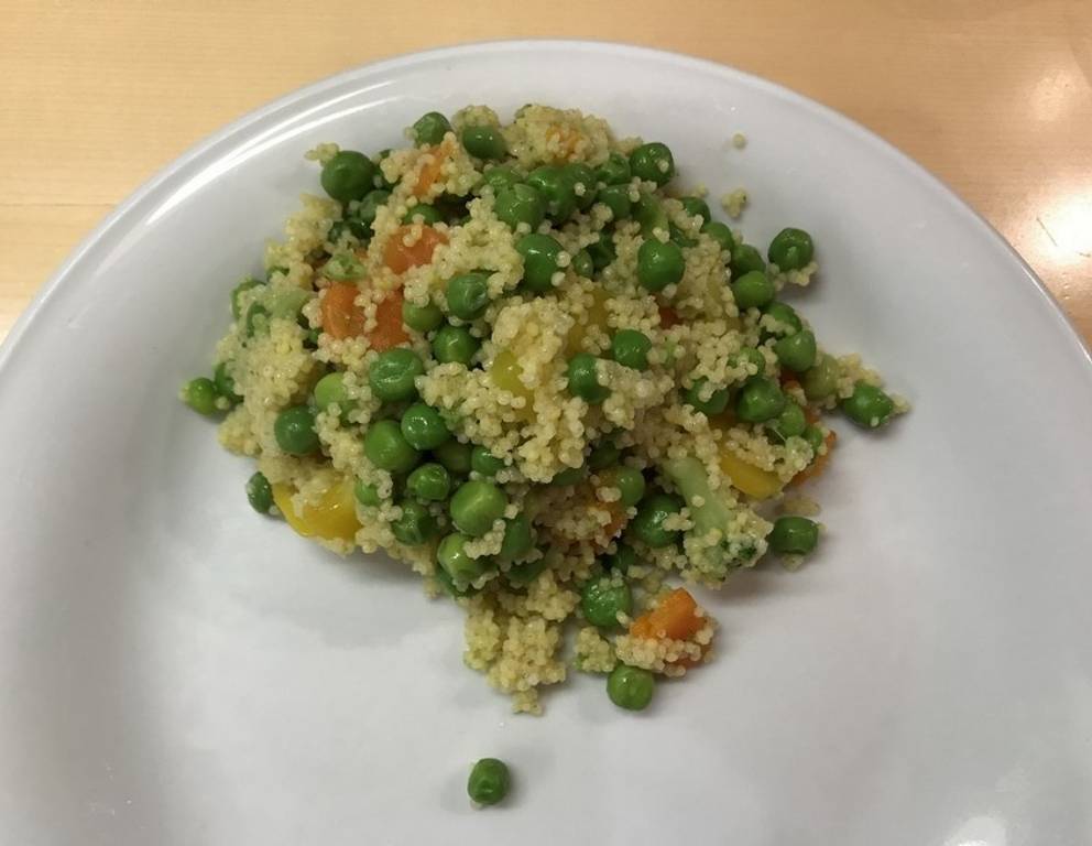 Erbsen und Hirse zugeben und mit Wasser (oder Gemüsesuppe) aufgießen. Auf kleiner Flamme ca. 15 Minuten kochen, bis die Hirse weich ist und die Suppe/Wasser aufgenommen hat.