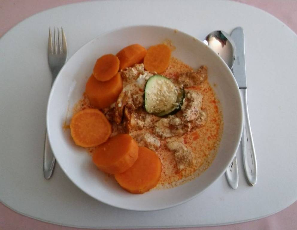 Das Hühnergeschnetzelte mit Zucchini und Süßkartoffeln anrichten und servieren.