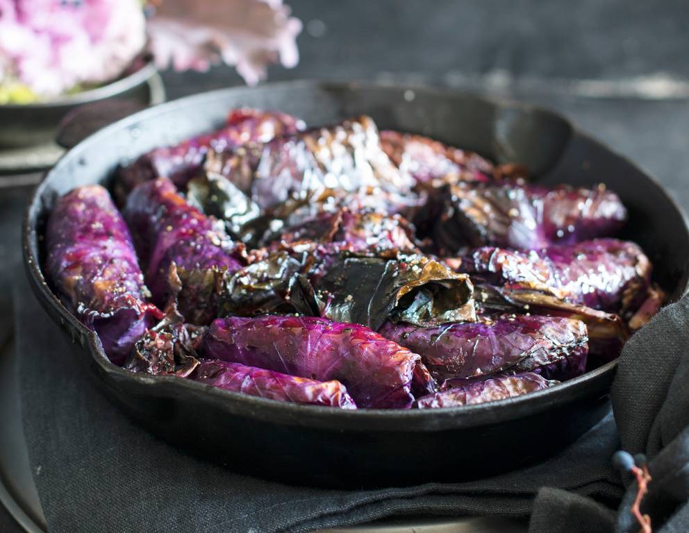 - Die Rotkrautrouladen im Ofen ca. 35 Minuten garen. Herausnehmen und heiß servieren. Am Teller mit dem Bratsaft beträufeln.