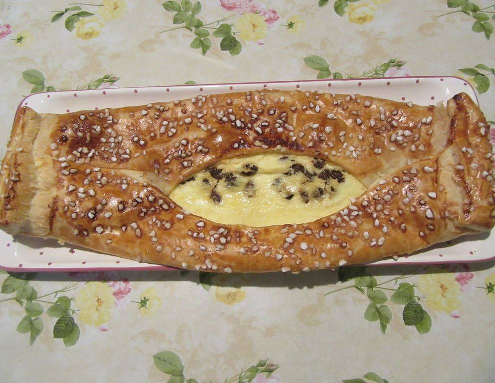 Den Blätterteig ausrollen, am Rand mit dem versprudelten Ei bestreichen und in der Mitte die Fülle einfüllen und die Rumrosinen darauf verteilen.