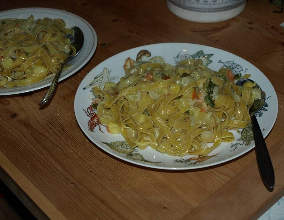 Das Kürbisgemüse mit Kokosmilch mit Ananas-Curry-Nudeln servieren.