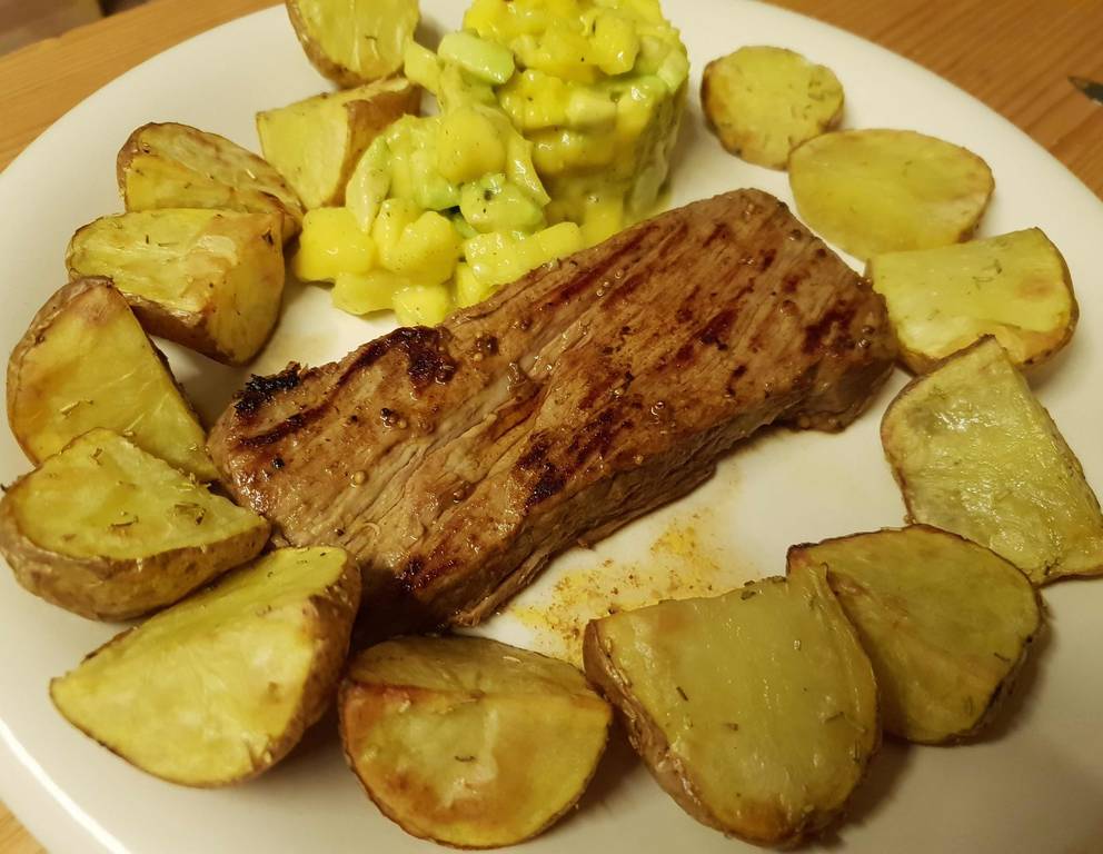 Das Steak mit Mango-Avocado Salsa und den Erdäpfeln anrichten und servieren.