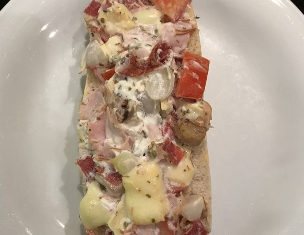 Das überbackene Schinken Baguette kann mit Zutaten nach Wahl variiert werden.
