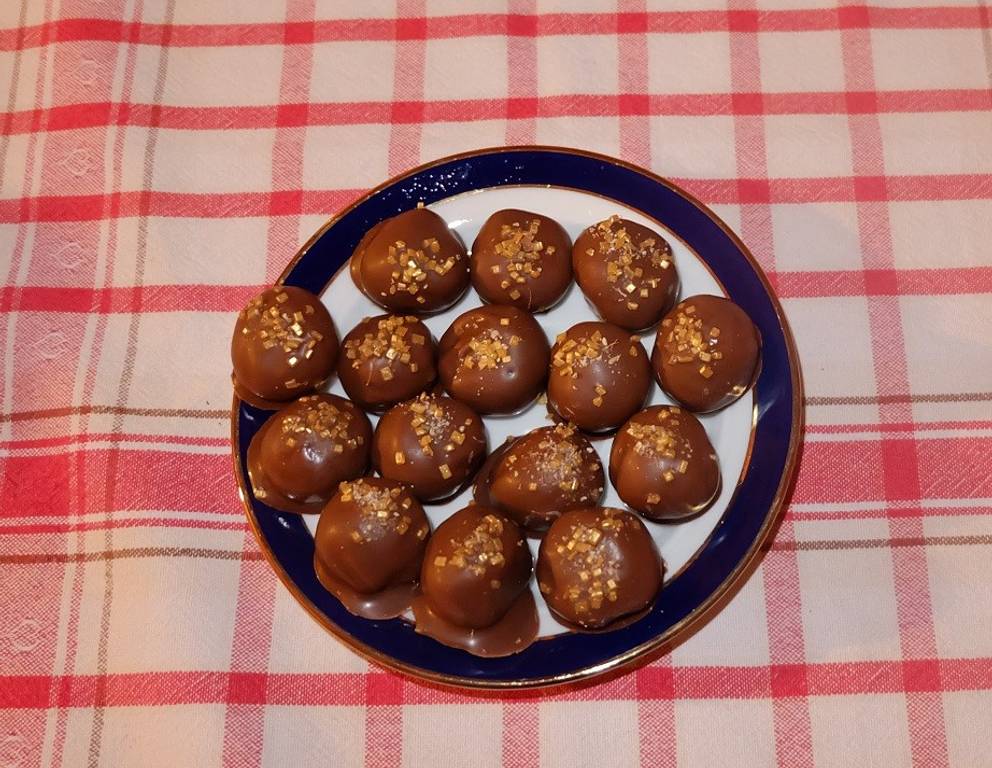 Daraus Kugeln formen und in erwärmte Milchschokoladeglasur tunken. Die getunkten Kugeln lässt man auf einer Gabel abtropfen und schubst sie dann auf Backtrennpapier, wo sie gut trocknen und nicht festkleben.