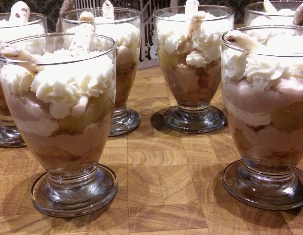 Das Schichtdessert mit Pudding und Äpfel kann auch ohne Alkohol zubereitet werden.