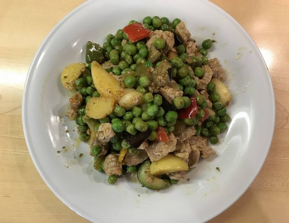 - Öl erhitzen und Zwiebel und Hühnerfleisch darin kurz, scharf anrösten Erbsen, Paprika und Kartoffeln zugeben und ca. 5 Minuten scharf anrösten.
