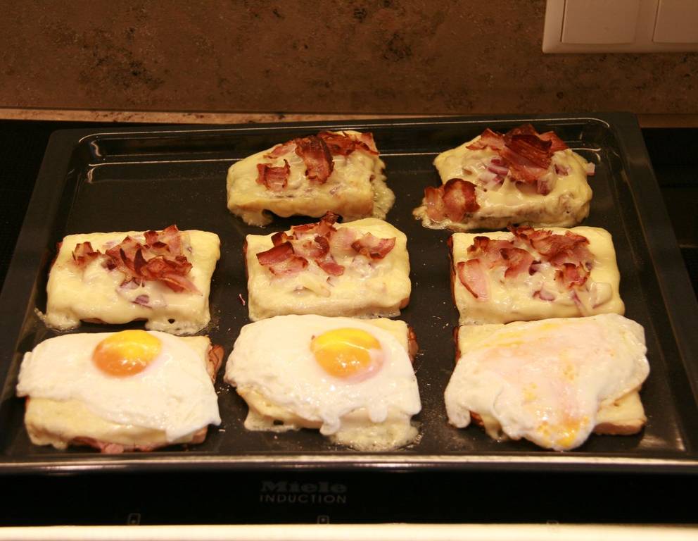 Für eine besonders feine Toastvariante gehackten Paprika (anstelle des Zwiebels) auf den Schinken-Käse-Belag streuen und vor dem Backen oben, direkt auf die Käsescheibe, eine Paradeisscheibe setzen.