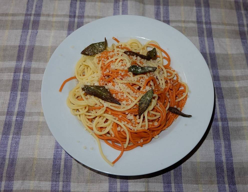 - Spaghetti auf zwei Tellern anrichten und mit den Salbeiblättern, dem Parmesan und der Butter servieren.