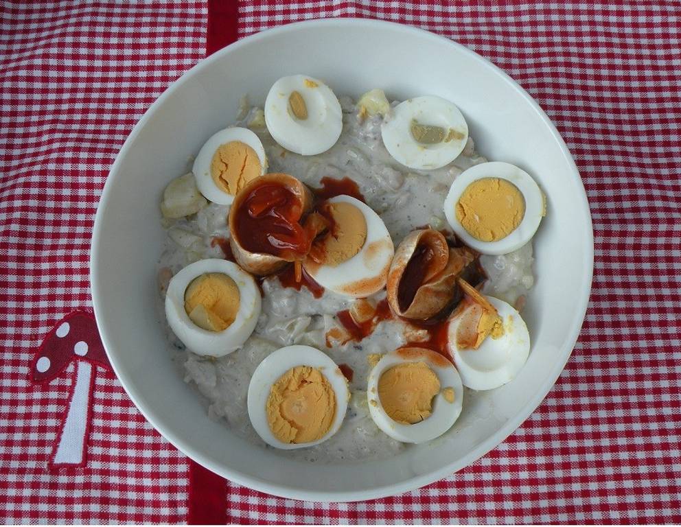 - Anschließend den Salat kalt stellen und etwas durchziehen lassen. Mit dem zweiten hartgekochten Ei und den Teufelsrollern dekorieren und den Heringsschmaus servieren.