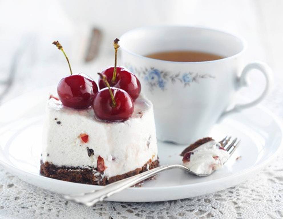 - Zum Servieren mithilfe der Folie stürzen und mit frischen Kirschen verzieren.