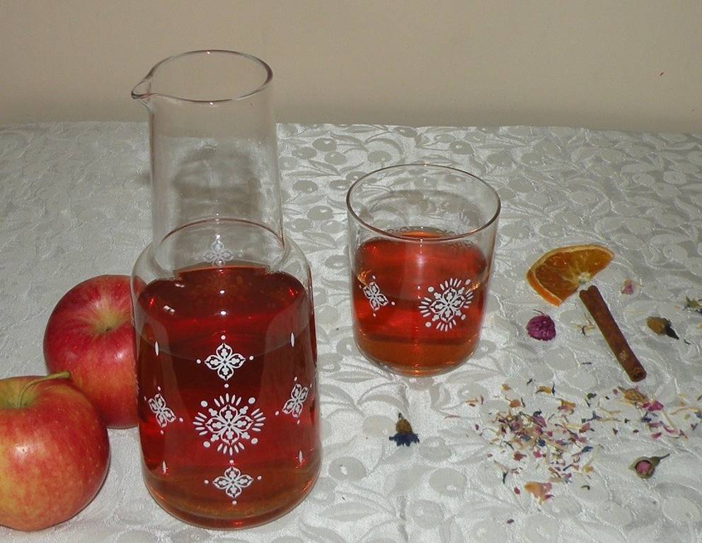 Mit Apfelsaft mischen und mit einer Zimtstange umrühren. Anstatt der getrockneten Orangenschale kann man auch getrocknete, kleingeschnittene Orangenscheiben verwenden.