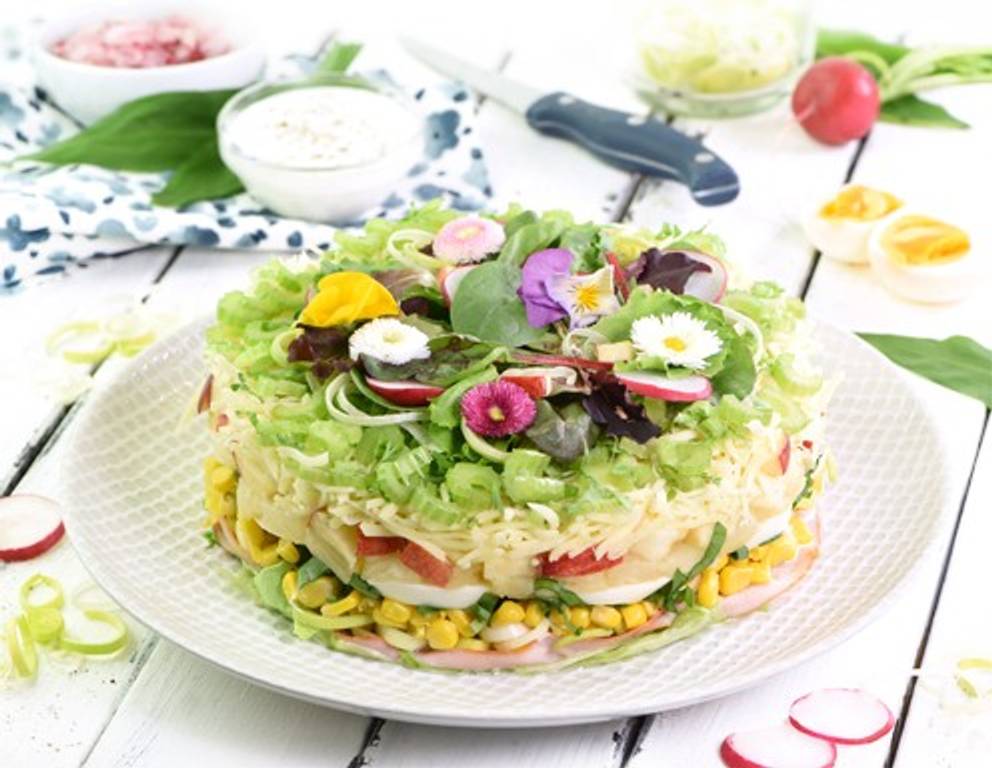 - Nun einen Tortenring auf einen Teller setzen und beginnend mit dem Salat die Torte wie folgt schichten: Schinken, Lauch, Mais, Sauce, Bärlauch, Eier, Ananas, Äpfel, Dressing und Käse.