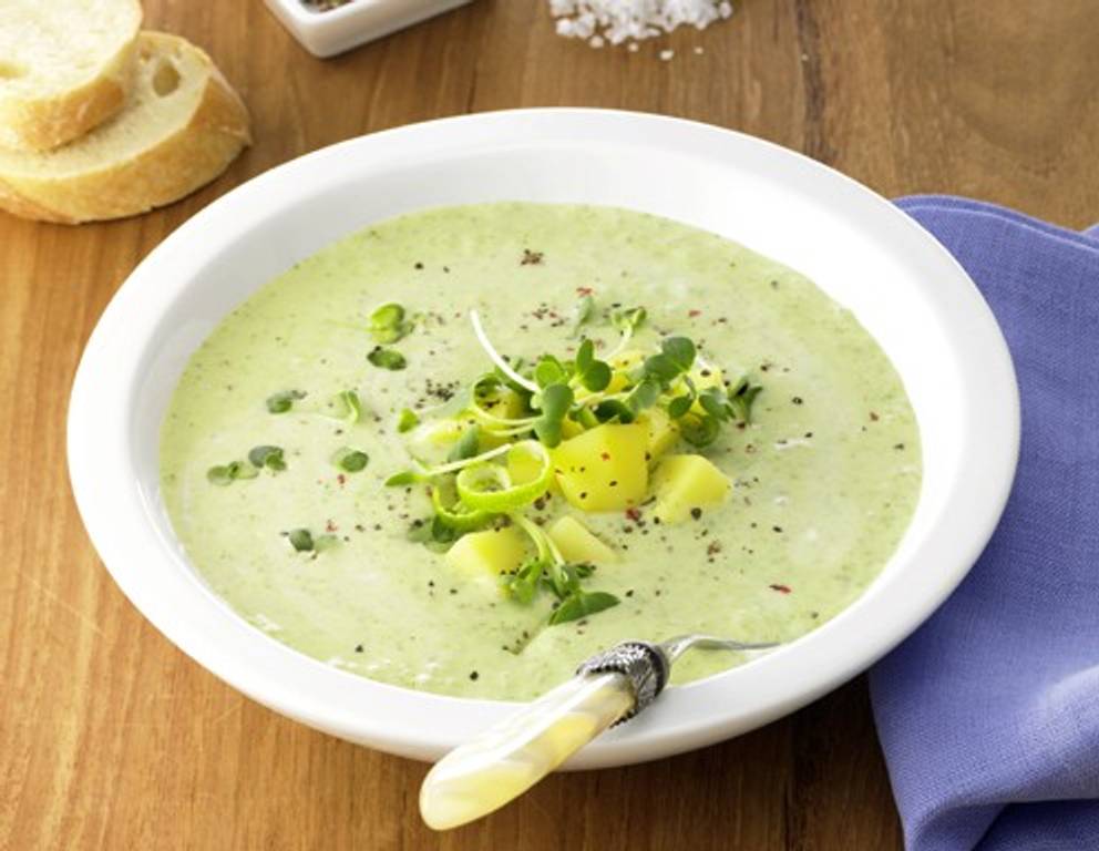 - Eine Suppenkelle Kartoffelstückchen und Kresse abnehmen. Den Rest der Kressesuppe pürieren, die entnommenen Kartoffelstücke wieder in die Suppe geben.