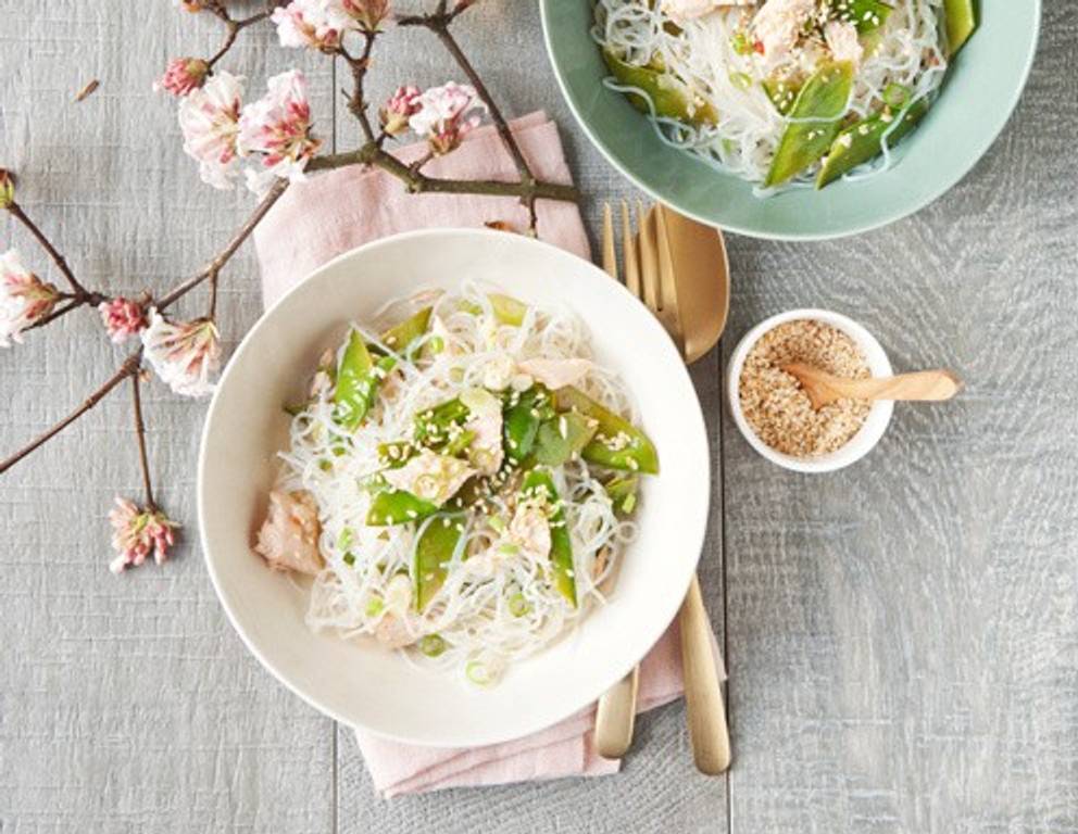 - Zuckerschoten, Lachs, Frühlingszwiebeln, Ingwer und Nudeln zum Dressing geben und alles vorsichtig vermischen. Sesam in einer Pfanne ohne Fett rösten und vor dem Servieren über den Salat streuen.