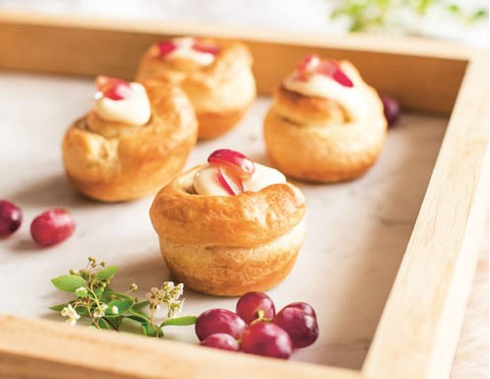 - Die Cruffins aus dem Ofen holen, etwas abkühlen lassen und mit dem Messer in die Oberseite vorsichtig kleine Vertiefungen eindrücken. Die Creme mit dem Spitzbeutel in die Cruffins füllen und mit den Weintrauben garnieren.