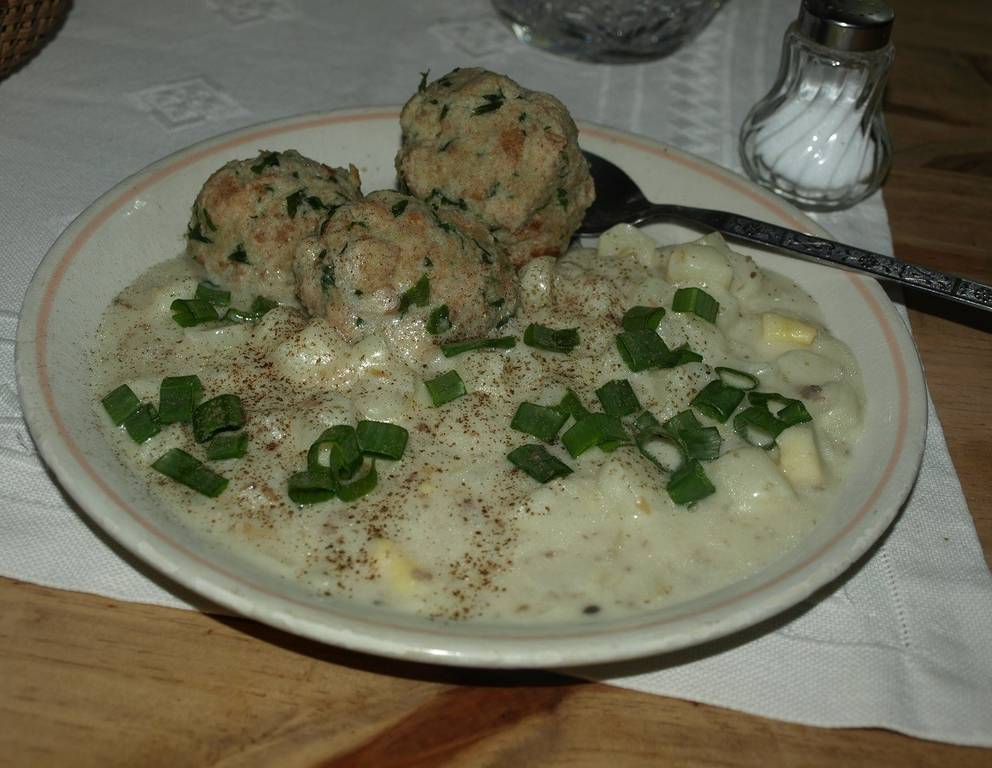 Mit etwas Zwiebelkraut bestreuen. Die übrig gebliebenen Bärlauchknödel lassen sich gut einfrieren.