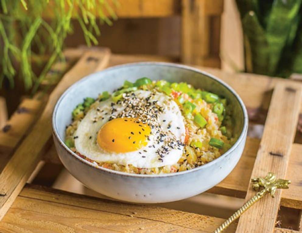 - Den Karfiol Reis in zwei Schalen füllen, jeweils ein Spiegelei darauflegen und mit Frühlingszwiebeln und Sesam bestreuen.