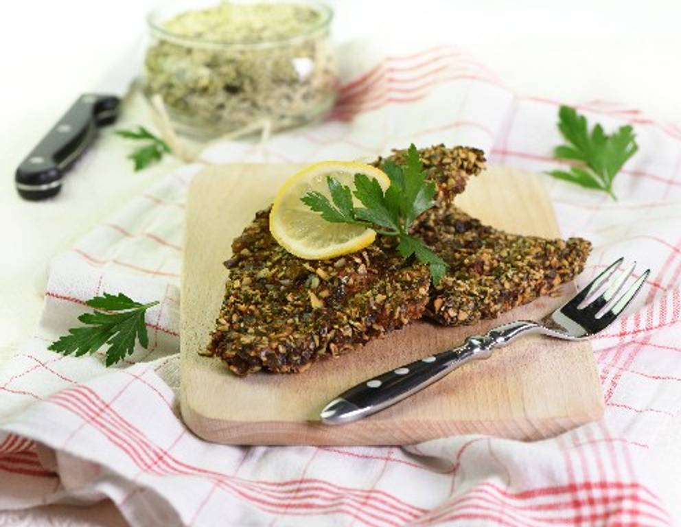 Danach die Kalbsschnitzel durch die Eier ziehen und abschließend großzügig in den gehackten Kürbiskernen wenden.