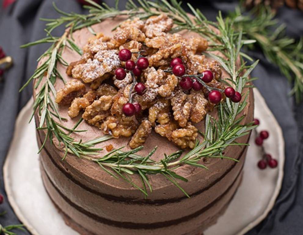 - Vor dem Servieren den Tortenrand mit den frischen Rosmarinzweigerln sowie die Torte mit kandierten Nüssen und optional ein paar frischen Cranberries garnieren.