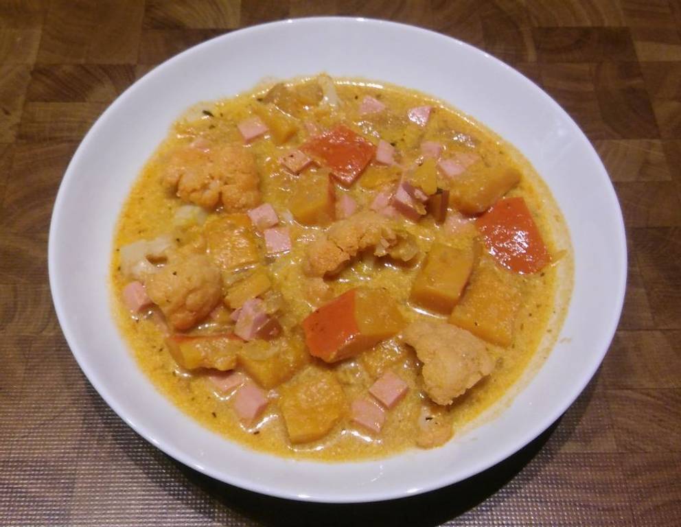 - Mit der klaren Suppe aufgießen, würzen und aufkochen lassen. Zuerst die Kürbiswürfel dazugeben, die Hitze reduzieren, nach ein paar Minuten den Karfiol hinzufügen und bissfest köcheln.