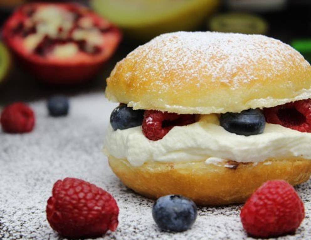- Die Krapfen aufschneiden und nach Wahl mit Schlagobers, Schokocreme sowie Obst und Früchten belegen. Abschließend mit Staubzucker bestäuben.