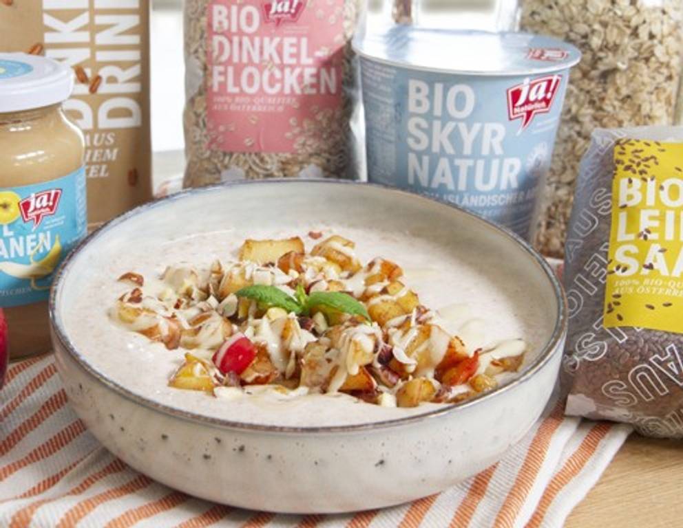 - Die Ja!Natürlich Dinkelflocken, Ja!Natürlich Dinkeldrink, Wasser, Skyr, Apfel-Bananenmus, Ja!Natürlich Leinsamen und 1/2 Teelöffel Ja!Natürlich Zimt miteinander verrühren und mindestens 3-4 Stunden im Kühlschrank quellen lassen.