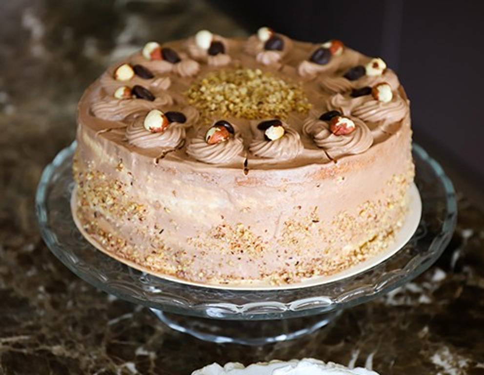 Ring entfernen, die Torte mit der übrig gebliebenen Nuss Nougat Creme  einkleiden – etwas Creme für die Dekoration aufheben. Zum Schluss die  Torte mit gemahlenen und ganzen Nüssen, sowie mit den Kaffee Schokoladen  Drops verzieren.