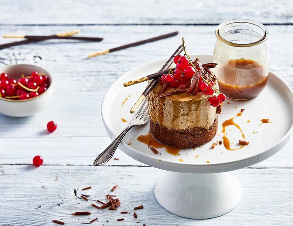 - Die Küchlein aus den Dessertringen lösen und mit Karamellsauce, Schokoladenraspeln, Johannisbeeren und Mikado Sticks dekorieren.