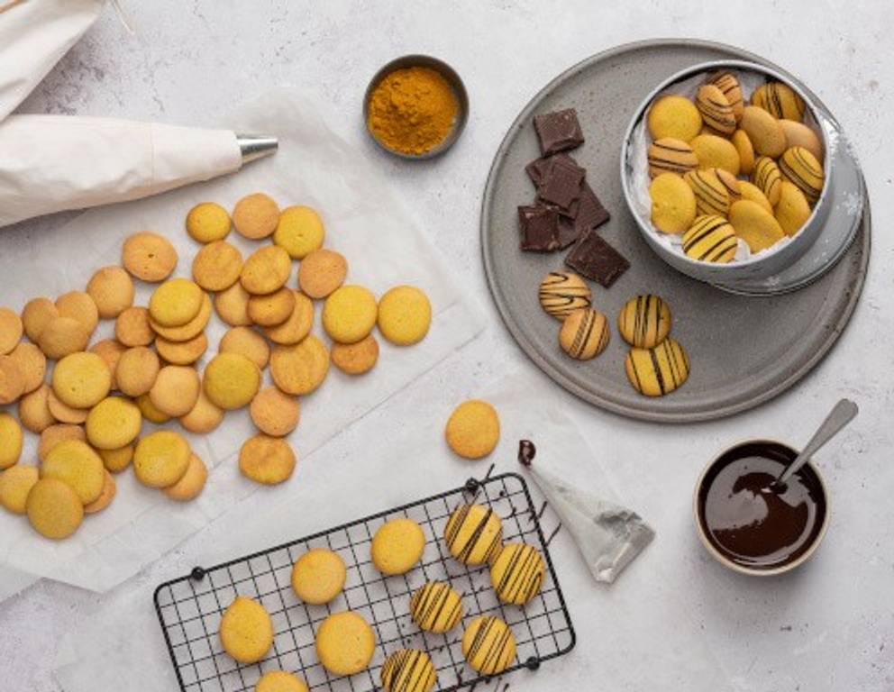 - Die Keksmasse in einen Dressiersack mit Lochtülle füllen und Punkte (ca. 1 cm Durchmesser) auf ein mit Backpapier ausgelegtes Blech dressieren.