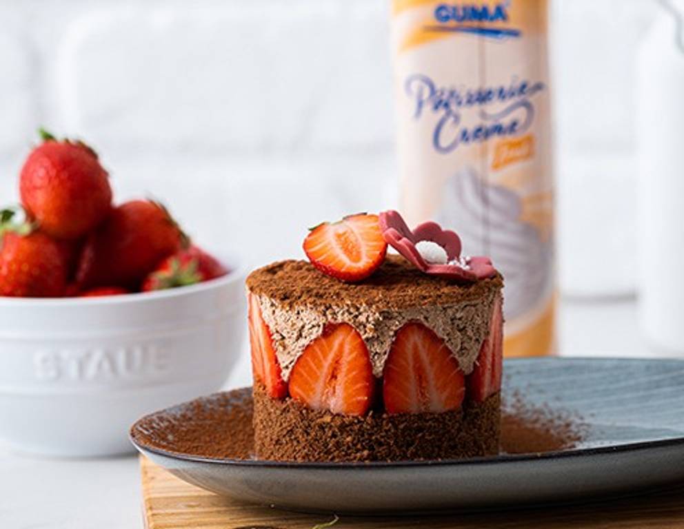 - Nun die Schokoladencreme auf den Erdbeeren verteilen und glatt streichen. Bis zum Servieren kühl stellen und zuletzt die Folie abziehen, mit Kakao bestreuen und etwas dekorieren.