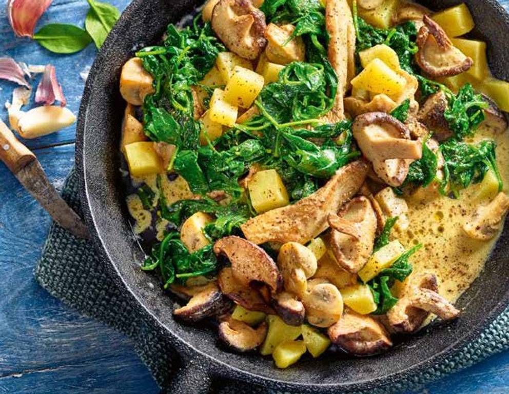 - Während dessen Babyspinat waschen und abtropfen lassen. Nach der Garzeit zum Pilzgulasch geben und gut vermengen,bis der Spinat zusammengefallen ist. Mit Senf, Salz und Pfeffer abschmecken.