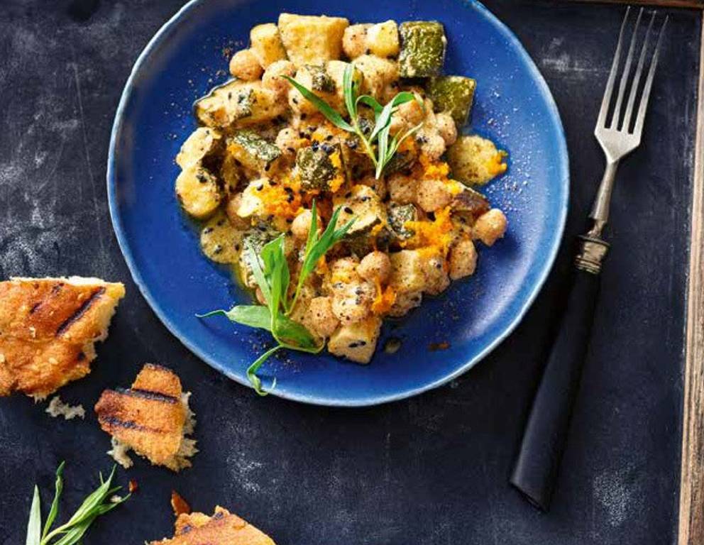 - Zucchini waschen und in etwa 2 cm große Würfelschneiden. Butter in einem Topf aufschäumen und die Zucchini darin anbraten. Marzipan in kleine Stücke teilen, mit den Kichererbsen dazugeben undalles 1–2 Minuten anbraten.