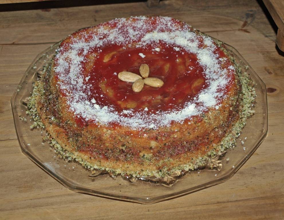 Für die Weiße Mohntorte zuerst die Eier trennen. Eiklar mit etwas Zitronensaft steif schlagen. Eidotter, Staubzucker, Vanillezucker und Walnussöl schaumig rühren. Die restlichen Zutaten dazu mengen. Eischnee unterheben. In eine befettete und bemehlte Tortenform steichen und bei 180° C backen. Die ausgekühlte Torte mit Himbeermarmelade bestreichen. In der Mitte mit den Mandeln verzieren und mit der gerieben weißen Schokolade und den Kürbiskernen bestreuen.