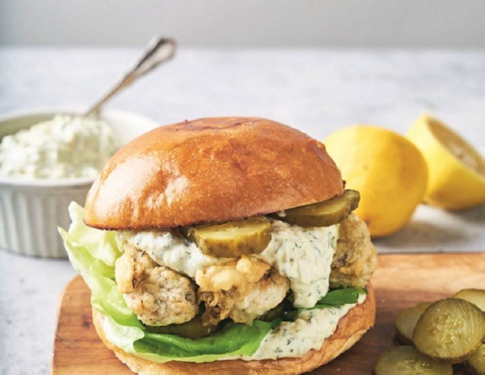 - Schnittflächen der Buns großzügig mit Sauce Tartare bestreichen. Toppings auf die untere Hälfte legen. Pro Bun 2 gebackene Sardinen darauflegen und die Bun-Oberseite aufsetzen.